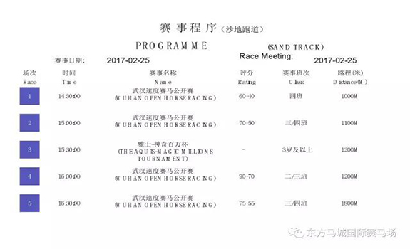 周六,(2月25日),2017武汉速度赛马公开赛将迎来第二个主题赛马日——“乐在马城”主题赛马日。本次主题赛马日共有59匹赛驹报名参赛,其中,2017年“雅士-神奇百万”系列赛事首战,将在东方马城国际赛马场展开角逐。