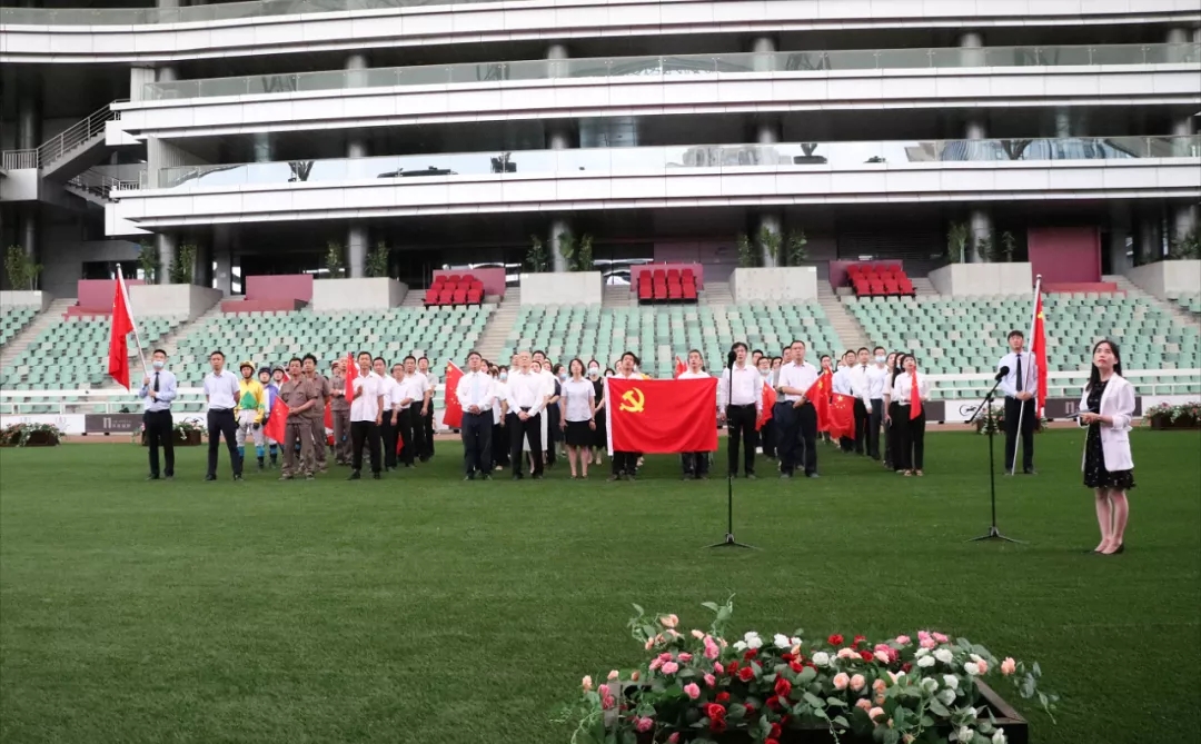 7月1日,是中国共产党成立100周年的大喜日子,东方神马集团全体员工在东方马城国际赛马场室内亮相圈隆重举行庆祝活动,庆祝党的生日,向伟大的党表达党带领中国人民站起来、富起来、强起来的感激之情。今天,也恰逢香港回归祖国24周年,作为改革开放之初,在武汉投资兴业的港资企业,深感作为中国人的荣耀。东方神马集团作为武汉赛马产业发展探路者,能为武汉建设世界级赛马之都奉献心力,全体员工深感自豪!在集团创业发展的道路上,正是因为有了党的改革开放政策的指引,一路走来,才能攻坚克难,在赛马添彩中国梦的道路上坚毅前行。